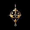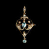A refined Edwardian pendant and brooch combination in 9ct yellow gold, showcasing the flowing curves and symmetrical floral forms of the early 20th-century Art Nouveau-inspired aesthetic. This beautifully crafted piece features a pale greenish-blue oval-cut aquamarine at its centre, complemented by an articulated aquamarine drop and framed by delicate split pearls.