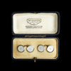 A finely crafted pair of Art Deco double-sided cufflinks by W. Hinds Ltd., presented in their original fitted retailer’s case. The cufflink faces feature silver-white guilloché enamel with a crisp engine-turned pattern, overlaid with mother-of-pearl and centred by a single seed pearl. The elegance of the geometric design, subtle iridescence, and refined gold border reflect the sophisticated style of the interwar period.
